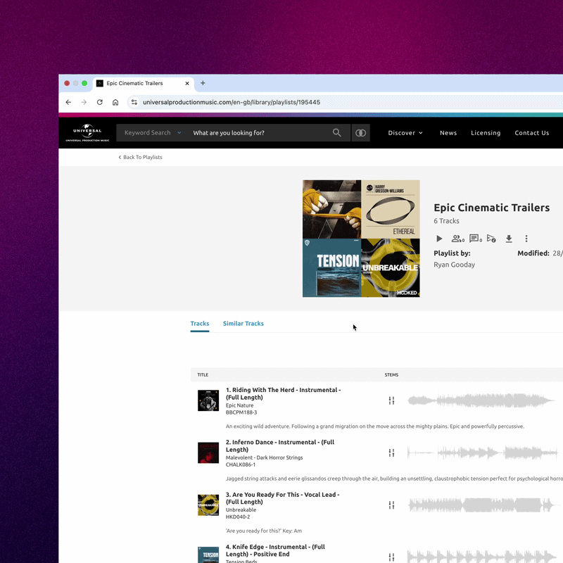 Exploring similar tracks is seamlessly built into your workflow as you browse, create and edit your playlists. Powered by advanced technology and refined metadata, Similar Tracks delivers relevant new track suggestions based on your existing playlist curation, so you can find more music, even faster.